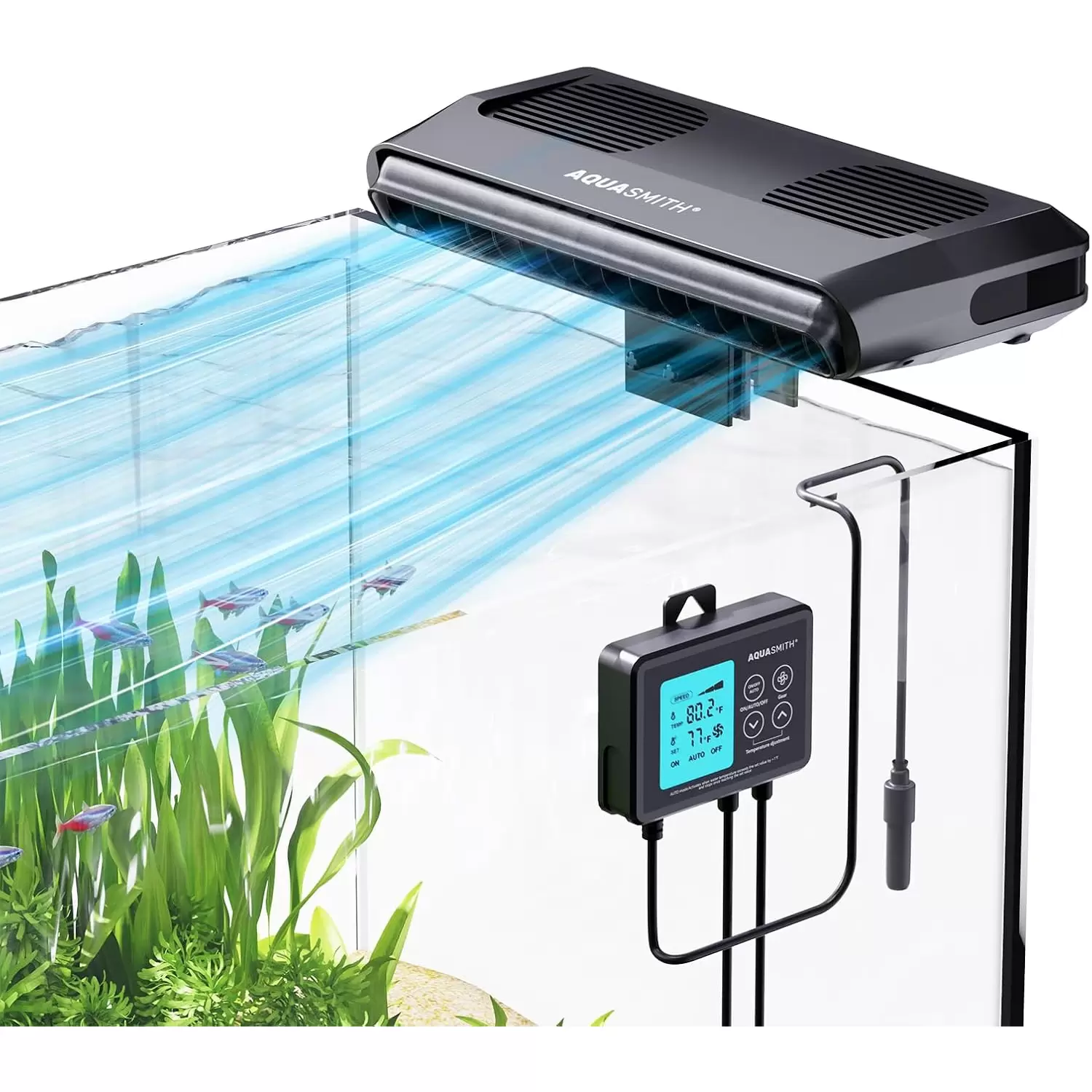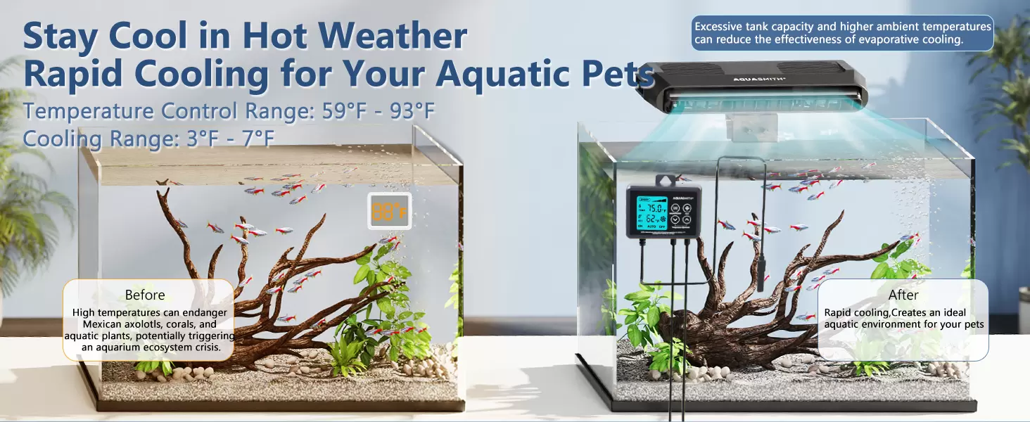 Enfriador necesario para acuarios: el calor del verano está poniendo en peligro la salud de tu axolotl, pero el ventilador de acuario AQUASMITH proporciona el apoyo profesional. A diferencia de los costosos enfriadores, ofrece un ventilador de refrigeración de acuario asequible y eficiente. A diferencia de los ventiladores normales, utiliza el principio de enfriamiento evaporativo y cuenta con un verdadero sistema de control de temperatura, con una potente capacidad de enfriamiento (3°F-7°F), creando un ambiente ideal para tus mascotas.