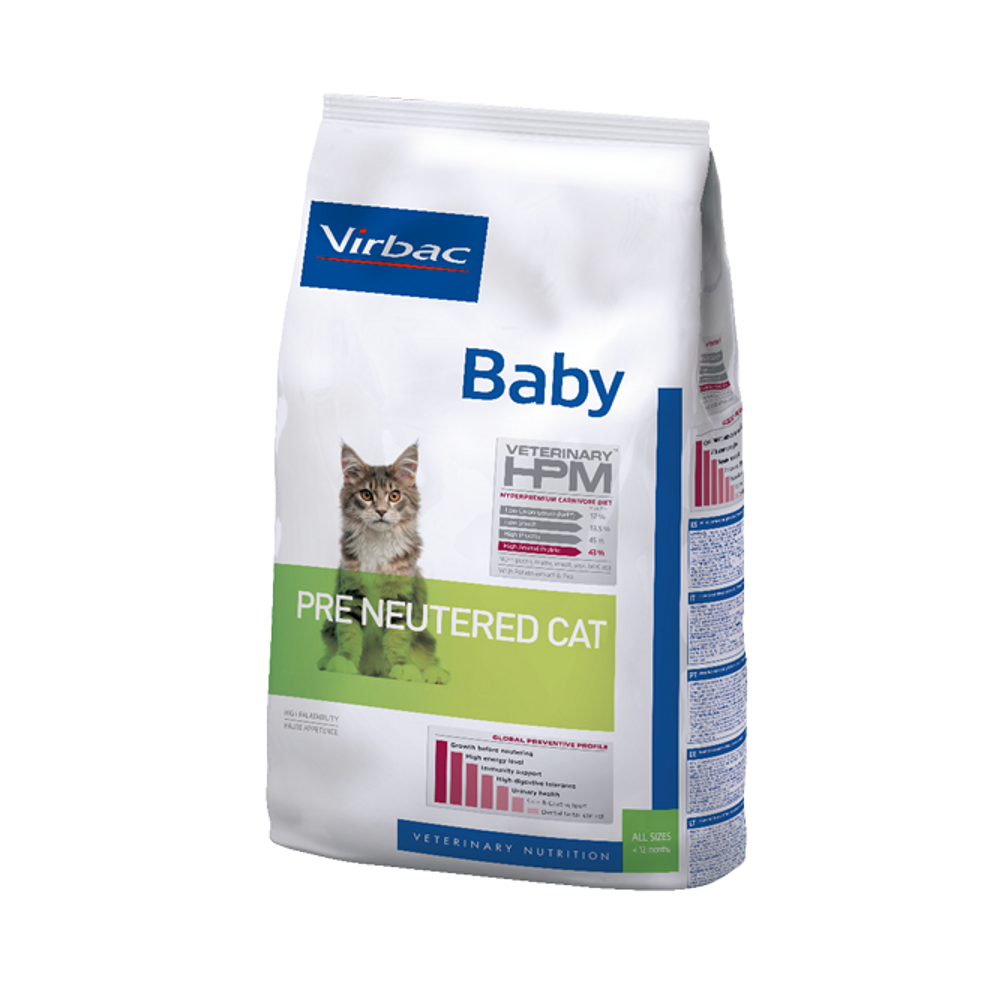 Los gatitos tienen unos requisitos estrictos para un crecimiento saludable, particularmente en términos de energía, proteínas y minerales. Tienen el sistema digestivo delicado y el sistema necesario para generar defensas contra enfermedades es todavía inmaduro, por ello la alimentación Veterinary HPM™ Baby Pre Neutered Cat cuenta con todos los requerimientos nutricionales necesarios para la correcta salud de los gatitos y gatas gestantes y lactantes.