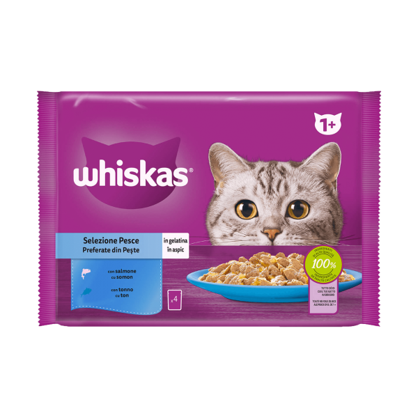 WHISKAS SELECCIÓN DE PESCADO SALMÓN Y ATÚN EN GELATINA 4x100gr